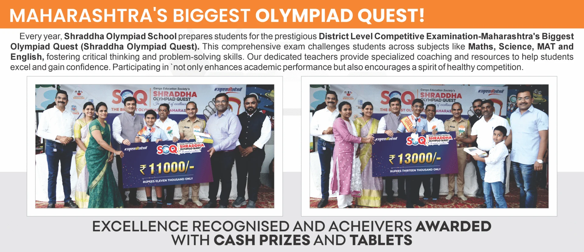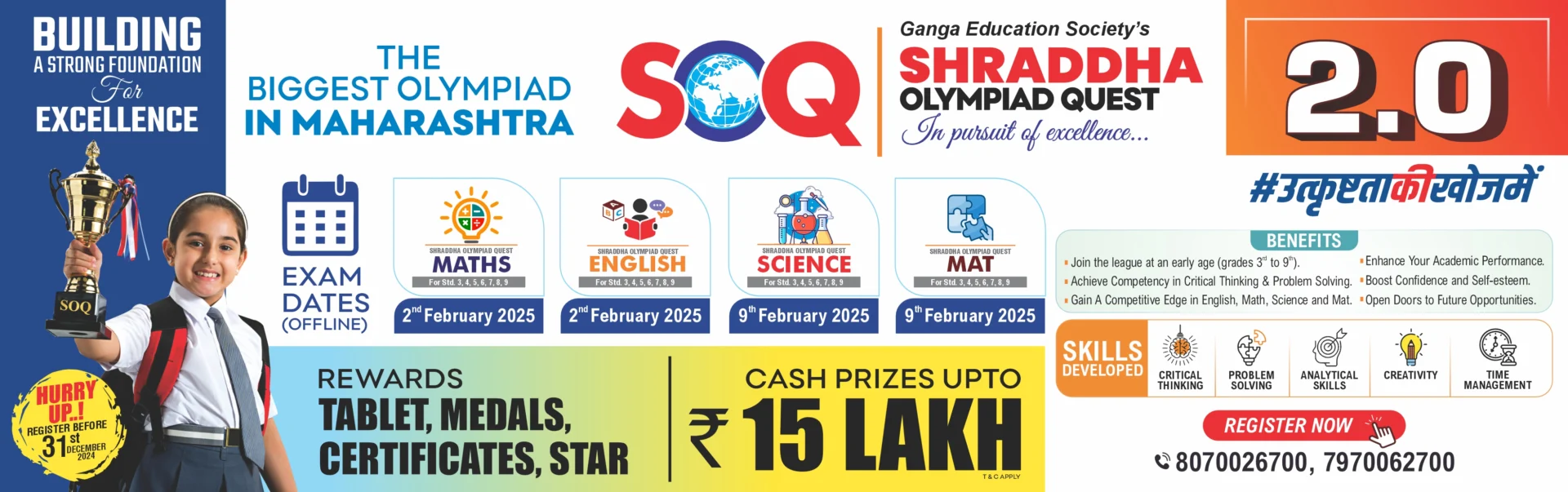 Shraddha Olympiad Quest(SOQ) ,one of the biggest talent encouragement exam in Maharashtra. SOQ encourages talent and provides unparalleled exposure to the students who wish to appear in national and international competitive exams. It evaluates the academic potential and allows students to assess their performance at state level. SOQ helps students nurture their minds for higher targets of tomorrow and empowers them to prepare for competitive exams. Through these examinations, SOQ strives to inspire, nurture, and reward young talents.